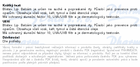Blistex Lip Balzám je určen na suché a popraskané rty. Působí jako prevence proti oparům. Obsahuje včelí vosk, kafr, tymol a čisté éterické oleje. Má ochranný sluneční faktor 10, UVA/UVB filtr a je dermatologicky testován.