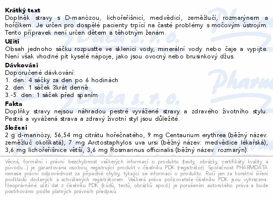 Doplněk stravy s D-manózou, lichořeřišnicí, medvědicí, zeměžlučí, rozmarýnem a hořčíkem. Je určen pro dospělé pacienty trpící na časté problémy s močovým ústrojím. Tento přípravek není určen dětem a těhotným ženám.