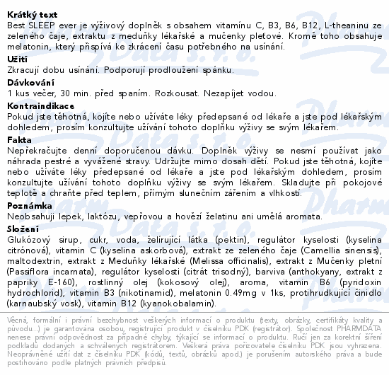 Best SLEEP ever je výživový doplněk s obsahem vitamínu C, B3, B6, B12, L-theaninu ze zeleného čaje, extraktu z meduňky lékařské a mučenky pleťové. Kromě toho obsahuje melatonin, který přispívá ke zkrácení času potřebného na usínání.
