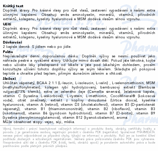 Doplněk stravy. Pro krásné vlasy pro růst vlasů, zastavení vypadávaní s našimi extra účinnými kapslemi. Obsahuji směs aminokyselin, minerálů, vitamínů, přírodních extraktů, kolagenu, kyseliny hyaluronové a MSM dodává vlasům silnou vzpruhu.