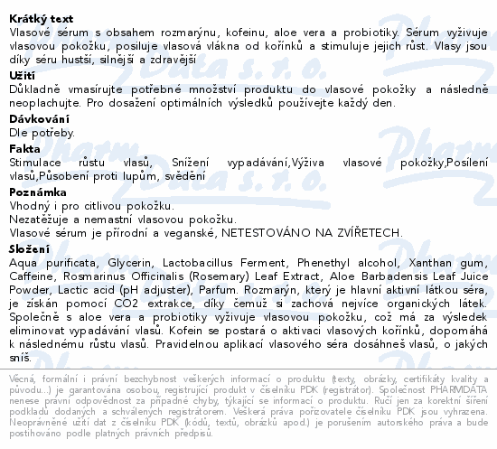 Vlasové sérum s obsahem rozmarýnu, kofeinu, aloe vera a probiotiky. Sérum vyživuje vlasovou pokožku, posiluje vlasová vlákna od kořínků a stimuluje jejich růst. Vlasy jsou díky séru hustší, silnější a zdravější