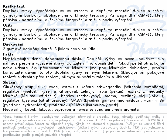 Doplněk stravy. Vypořádejte se se stresem a zlepšujte mentální funkce s našimi gumovými bonbóny, obohacenými o klinicky testovaný Ashwagandha KSM-66, který přispívá k normálnímu duševnímu fungování a snižuje pocity vyčerpání.