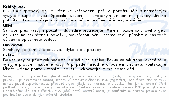 BLUECAP sprchový gel je určen ke každodenní péči o pokožku těla s nadměrným výskytem šupin a lupů. Speciální složení s aktivovaným zinkem má příznivý vliv na pokožku, kterou zvlhčuje a zároveň odstraňuje nepříjemné šupiny a svědění.