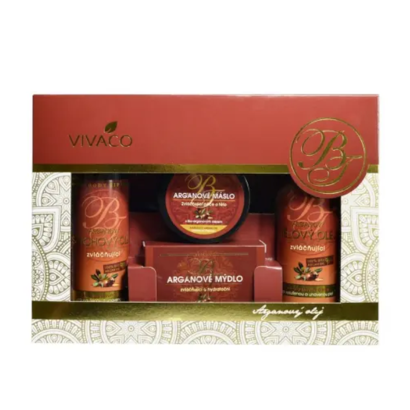 Dárkové balení Arganový olej obsahuje sprchový gel 200 ml, tělový olej 200 ml, tuhé mýdlo 100 g a arganové máslo 100 ml.