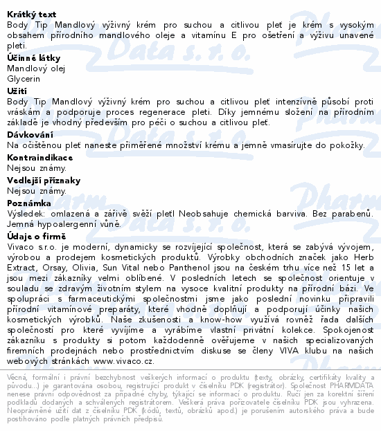 Body Tip Mandlový výživný krém pro suchou a citlivou pleť je krém s vysokým obsahem přírodního mandlového oleje a vitamínu E pro ošetření a výživu unavené pleti.