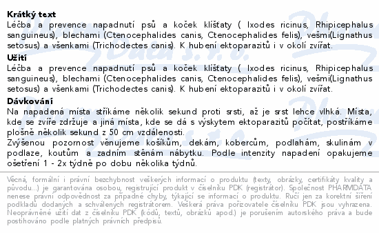 Léčba a prevence napadnutí psů a koček klíšťaty ( Ixodes ricinus, Rhipicephalus sanguineus), blechami (Ctenocephalides canis, Ctenocephalides felis), vešmi(Lignathus setosus) a všenkami (Trichodectes canis). K hubení ektoparazitů i v okolí zvířat.