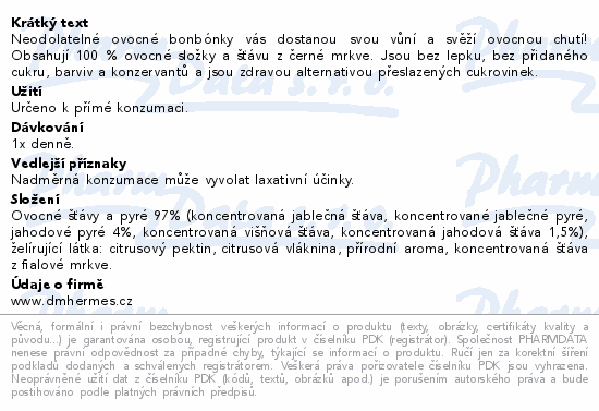 Neodolatelné ovocné bonbónky vás dostanou svou vůní a svěží ovocnou chutí! Obsahují 100 % ovocné složky a šťávu z černé mrkve. Jsou bez lepku, bez přidaného cukru, barviv a konzervantů a jsou zdravou alternativou přeslazených cukrovinek.