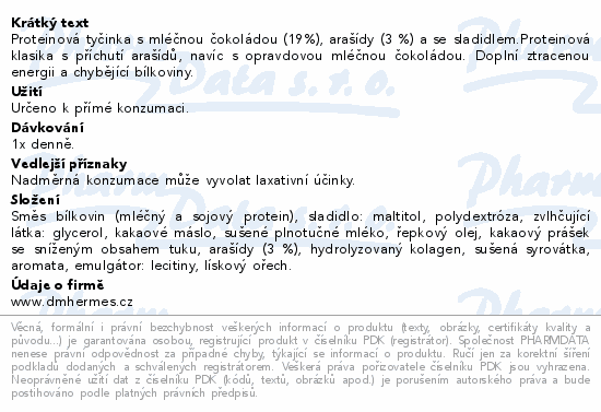 Proteinová tyčinka s mléčnou čokoládou (19%), arašídy (3 %) a se sladidlem.Proteinová klasika s příchutí arašídů, navíc s opravdovou mléčnou čokoládou. Doplní ztracenou energii a chybějící bílkoviny.