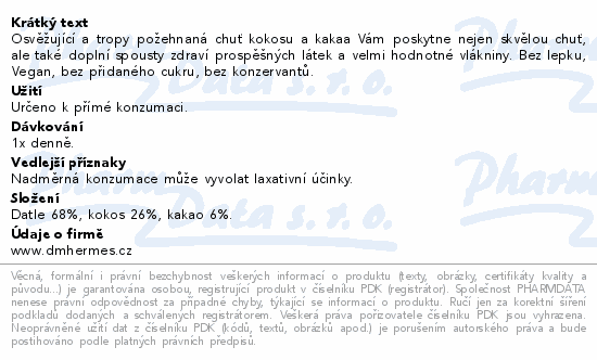 Osvěžující a tropy požehnaná chuť kokosu a kakaa Vám poskytne nejen skvělou chuť, ale také doplní spousty zdraví prospěšných látek a velmi hodnotné vlákniny. Bez lepku, Vegan, bez přidaného cukru, bez konzervantů.
