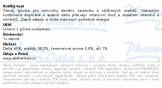 Trendy tyčinka pro milovníky slaného karamelu a oblíbených arašídů. Netradiční kombinace doplněná o sušené datle překvapí intenzivní chutí a obsahem vitamínů a minerálů. Zlepší náladu a dodá maximum potřebné energie.