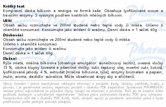 Komplexní dávka bílkovin a energie ve formě kaše. Obsahuje lyofilizované ovoce a trávícími enzymy. S vysokým podílem kvalitních mléčných bílkovin.