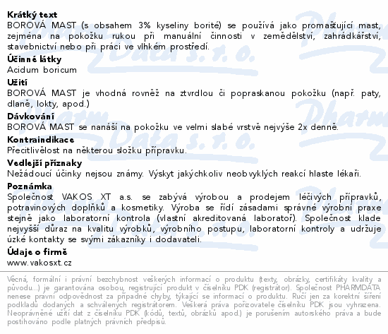 BOROVÁ MAST (s obsahem 3% kyseliny borité) se používá jako promašťující mast, zejména na pokožku rukou při manuální činnosti v zemědělství, zahrádkářství, stavebnictví nebo při práci ve vlhkém prostředí.