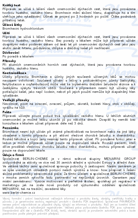 | Farmako-terapeutická skupina, účinné látky: | RESPIRAČNÍ SYSTÉM -> LÉČIVA PROTI NACHLAZENÍ A KAŠLI -> EXPEKTORANCIA, KROMĚ KOMBINACÍ S ANTITUSIKY -> MUKOLYTIKA -> BROMHEXIN |