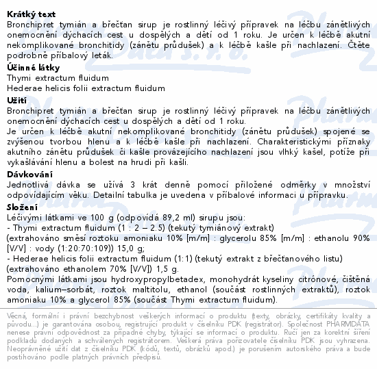 Bronchipret tymián a břečťan sirup je rostlinný léčivý přípravek na léčbu zánětlivých onemocnění dýchacích cest u dospělých a dětí od 1 roku. Je určen k léčbě akutní nekomplikované bronchitidy (zánětu průdušek) a k léčbě kašle při nachlazení. Čtěte pozorně příbalový leták.