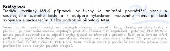 Tradiční rostlinný léčivý přípravek používaný ke zmírnění podráždění hltanu a souvisejícího suchého kašle a k podpoře vykašlávání viskózního hlenu při kašli spojeném s nachlazením. Čtěte pozorně příbalový leták.