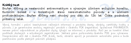 Brufen 400mg je nesteroidní antirevmatikum s výrazným účinkem snižujícím horečku, tlumícím bolest i u bolestivých stavů nerevmatického původu a s účinkem protizánětlivým. Brufen 400mg není vhodný pro děti do 12ti let. Čtěte pozorně příbalový leták.