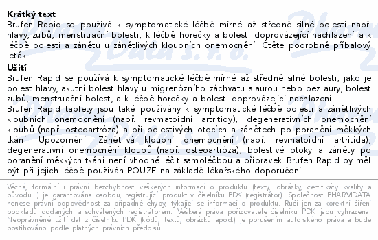 Brufen Rapid se používá k symptomatické léčbě mírné až středně silné bolesti např. hlavy, zubů, menstruační bolesti, k léčbě horečky a bolesti doprovázející nachlazení a k léčbě bolesti a zánětu u zánětlivých kloubních onemocnění. Čtěte pozorně příbalový leták.