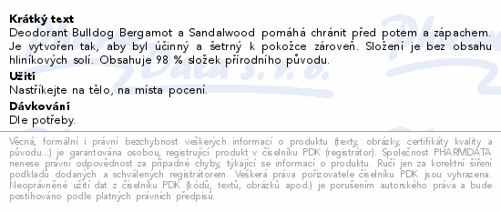 Deodorant Bulldog Bergamot a Sandalwood pomáhá chránit před potem a zápachem. Je vytvořen tak, aby byl účinný a šetrný k pokožce zároveň. Složení je bez obsahu hliníkových solí. Obsahuje 98 % složek přírodního původu.