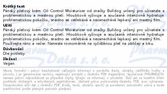 Pánský pleťový krém Oil Control Moisturizer od značky Bulldog určený pro uživatele s problematickou a mastnou pletí. Hloubkově vyživuje a současně intenzivně hydratuje problematickou pokožku, snadno se vstřebává a nezanechává lepkavý ani mastný film.