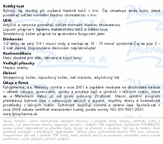 Bylinný čaj vhodný při zvýšené hladině tuků v krvi. Čaj obsahuje směs bylin, které pomáhají udržet normální hladinu cholesterolu v krvi.