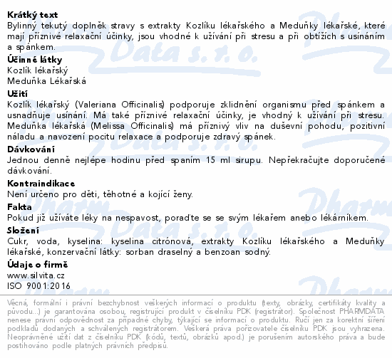 Bylinný tekutý doplněk stravy s extrakty Kozlíku lékařského a Meduňky lékařské, které mají příznivé relaxační účinky, jsou vhodné k užívání při stresu a při obtížích s usínáním a spánkem.