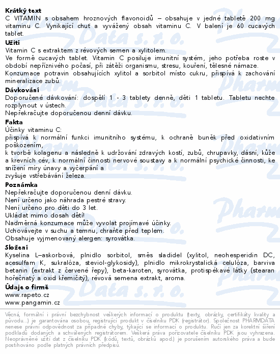 C VITAMIN s obsahem hroznových flavonoidů – obsahuje v jedné tabletě 200 mg vitaminu C. Vynikající chuť a vyvážený obsah vitaminu C. V balení je 60 cucavých tablet.