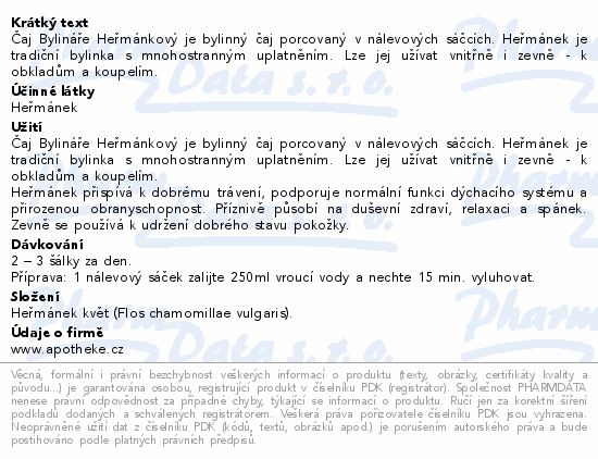 Čaj Bylináře Heřmánkový je bylinný čaj porcovaný v nálevových sáčcích. Heřmánek je tradiční bylinka s mnohostranným uplatněním. Lze jej užívat vnitřně i zevně - k obkladům a koupelím.