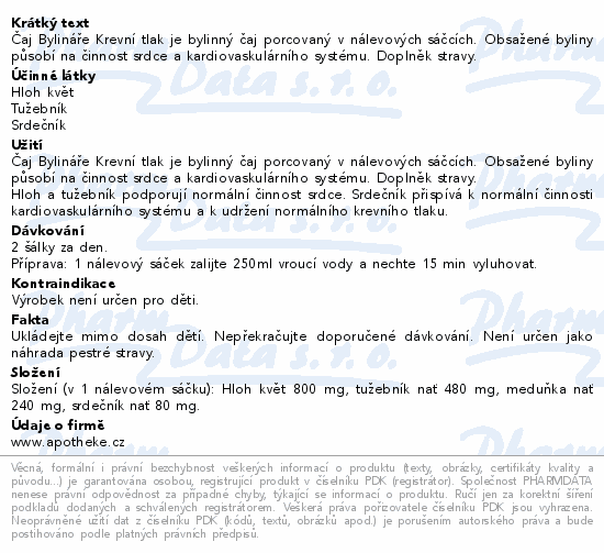 Čaj Bylináře Krevní tlak je bylinný čaj porcovaný v nálevových sáčcích. Obsažené byliny působí na činnost srdce a kardiovaskulárního systému. Doplněk stravy.