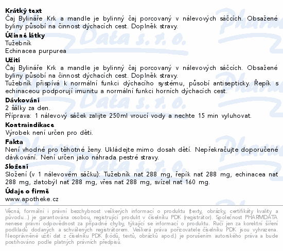 Čaj Bylináře Krk a mandle je bylinný čaj porcovaný v nálevových sáčcích. Obsažené byliny působí na činnost dýchacích cest. Doplněk stravy.