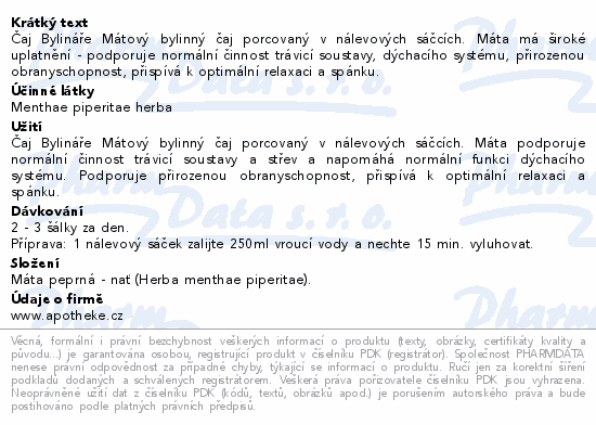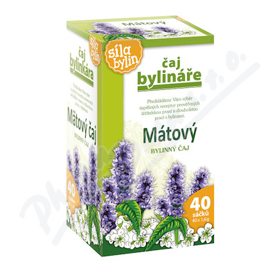 Čaj Bylináře Mátový bylinný čaj porcovaný v nálevových sáčcích. Máta má široké uplatnění - podporuje normální činnost trávicí soustavy, dýchacího systému, přirozenou obranyschopnost, přispívá k optimální relaxaci a spánku.