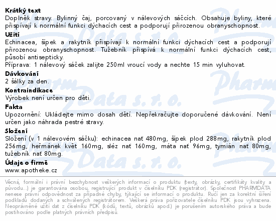 Doplněk stravy. Bylinný čaj, porcovaný v nálevových sáčcích. Obsahuje byliny, které přispívají k normální funkci dýchacích cest a podporují přirozenou obranyschopnost.