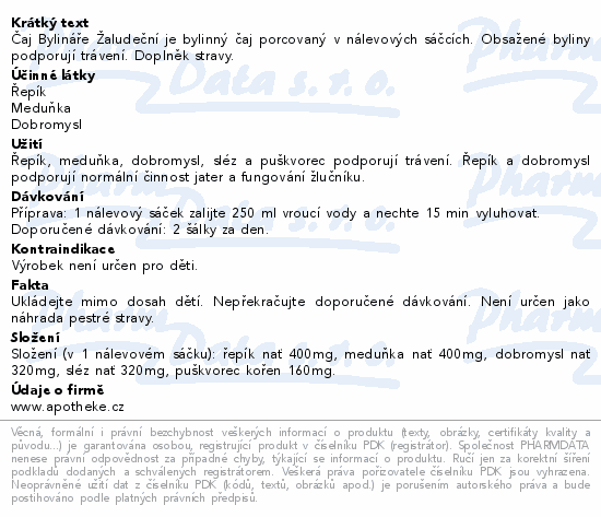 Čaj Bylináře Žaludeční je bylinný čaj porcovaný v nálevových sáčcích. Obsažené byliny podporují trávení. Doplněk stravy.