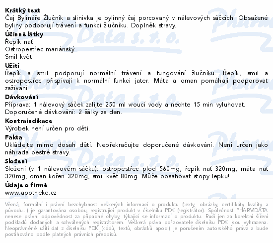 Čaj Bylináře Žlučník a slinivka je bylinný čaj porcovaný v nálevových sáčcích. Obsažené byliny podporují trávení a funkci žlučníku. Doplněk stravy.