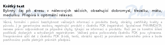 Bylinný čaj při stresu v nálevových sáčcích, obsahující dobromysl, třezalku, mátu, meduňku. Přispívá k optimální relaxaci.