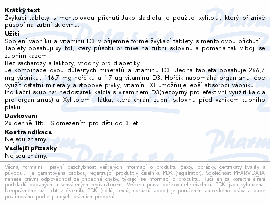Žvýkací tablety s mentolovou příchutí.Jako sladidla je použito xylitolu, který příznivě působí na zubní sklovinu.