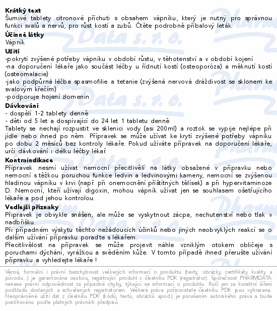 Šumivé tablety citronové příchuti s obsahem vápníku, který je nutný pro správnou funkci svalů a nervů, pro růst kostí a zubů. Čtěte pozorně příbalový leták.