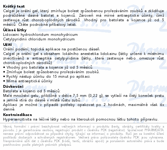 Calgel je orální gel, který zmírňuje bolest způsobenou prořezáváním zoubků a zklidňuje podrážděné dásně batolat a kojenců. Zároveň má mírné antiseptické účinky, čímž zastavuje růst choroboplodných zárodků. Vhodný pro batolata a kojence již od 5 měsíců. Čtěte pozorně příbalový leták.