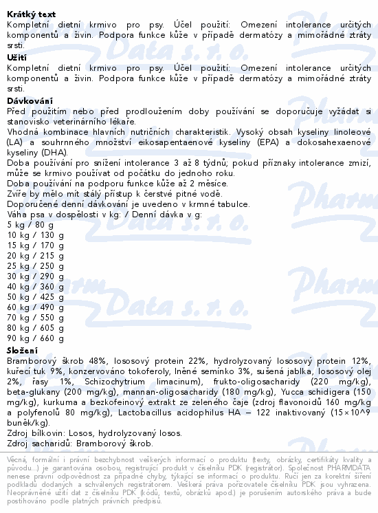Kompletní dietní krmivo pro psy. Účel použití: Omezení intolerance určitých komponentů a živin. Podpora funkce kůže v případě dermatózy a mimořádné ztráty srsti.