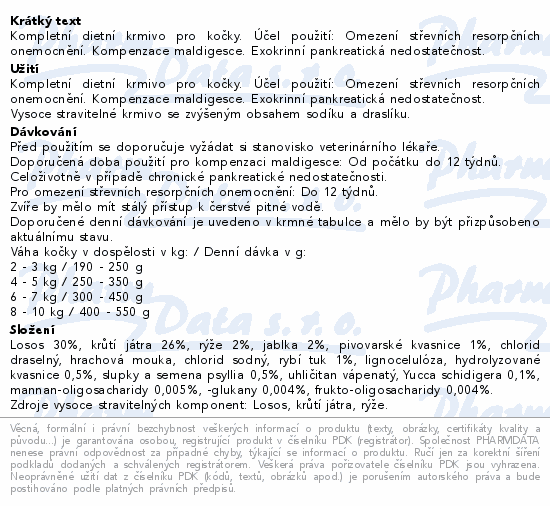 Kompletní dietní krmivo pro kočky. Účel použití: Omezení střevních resorpčních onemocnění. Kompenzace maldigesce. Exokrinní pankreatická nedostatečnost.