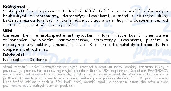 Canesten krém je účinné širokospektré antimykotikum s léčivou látkou klotrimazol, která brání rozmnožování původců kožní mykózy. Je vhodný také na léčbu mykóz v intimní oblasti žen i mužů. Canesten krém je bílý krém měkké konzistence, velice dobře se nanáší a roztírá na postiženou plochu a rychle se vstřebává.