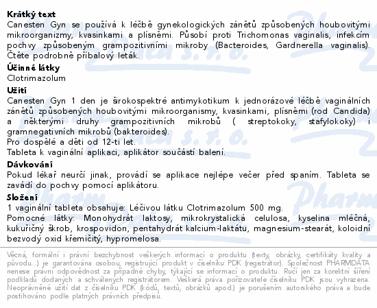 Canesten Gyn se používá k léčbě gynekologických zánětů způsobených houbovitými mikroorganizmy, kvasinkami a plísněmi. Působí proti Trichomonas vaginalis, infekcím pochvy způsobeným grampozitivními mikroby (Bacteroides, Gardnerella vaginalis). Čtěte pozorně příbalový leták.