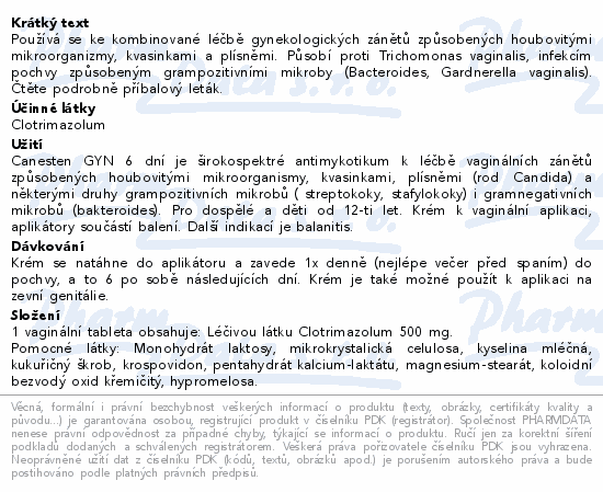Canesten Gyn se používá ke kombinované léčbě gynekologických zánětů způsobených houbovitými mikroorganizmy, kvasinkami a plísněmi. Působí proti Trichomonas vaginalis, infekcím pochvy způsobeným grampozitivními mikroby(Bacteroides, Gardnerella vaginalis). Čtěte pozorně příbalový leták.