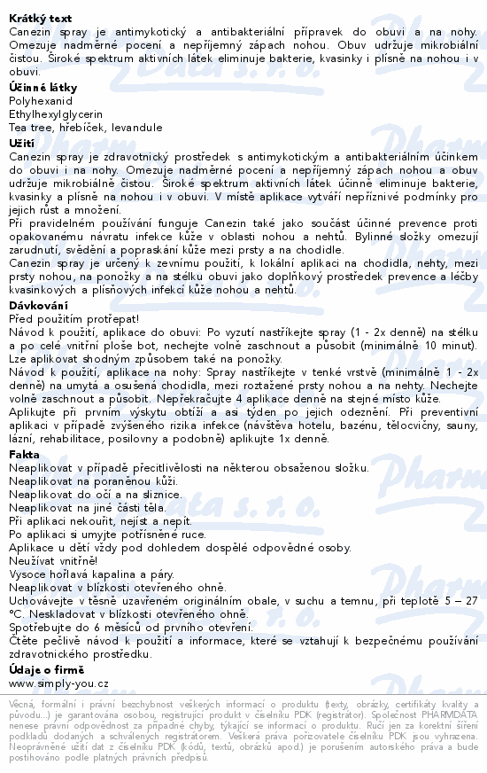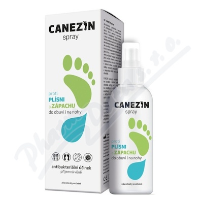 Canezin spray je antimykotický a antibakteriální přípravek do obuvi a na nohy. Omezuje nadměrné pocení a nepříjemný zápach nohou. Obuv udržuje mikrobiální čistou. Široké spektrum aktivních látek eliminuje bakterie, kvasinky i plísně na nohou i v obuvi.