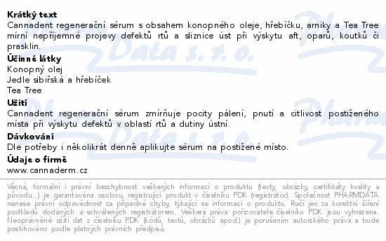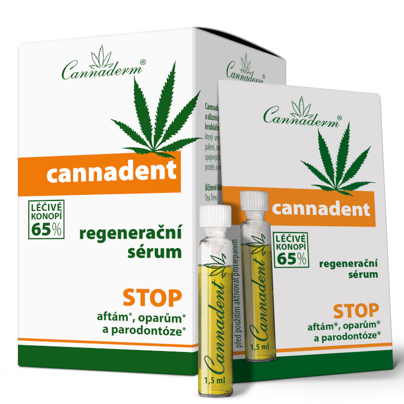 Cannadent regenerační sérum s obsahem konopného oleje, hřebíčku, arniky a Tea Tree mírní nepříjemné projevy defektů rtů a sliznice úst při výskytu aft, oparů, koutků či prasklin.