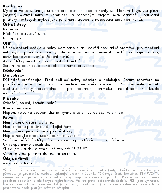 Mycosin Forte sérum je určeno pro speciální péči o nehty se sklonem k výskytu plísní (mykóz). Aktivní látky v kombinaci s konopným olejem 42% odstraňují průvodní příznaky nehtových mykóz jako je lámání, třepení a nežádoucí zabarvení nehtů.