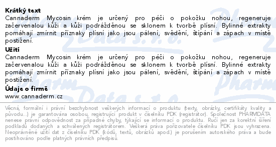 Cannaderm Mycosin krém je určený pro péči o pokožku nohou, regeneruje začervenalou kůži a kůži podrážděnou se sklonem k tvorbě plísní. Bylinné extrakty pomáhají zmírnit příznaky plísní jako jsou pálení, svědění, štípání a zápach v místě postižení.