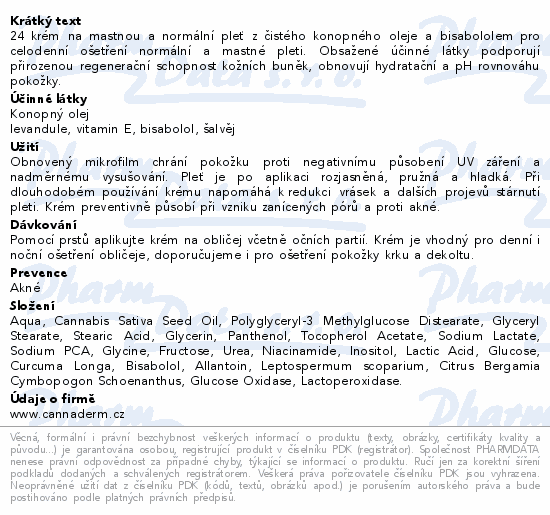 24 krém na mastnou a normální pleť z čistého konopného oleje a bisabololem pro celodenní ošetření normální a mastné pleti. Obsažené účinné látky podporují přirozenou regenerační schopnost kožních buněk, obnovují hydratační a pH rovnováhu pokožky.