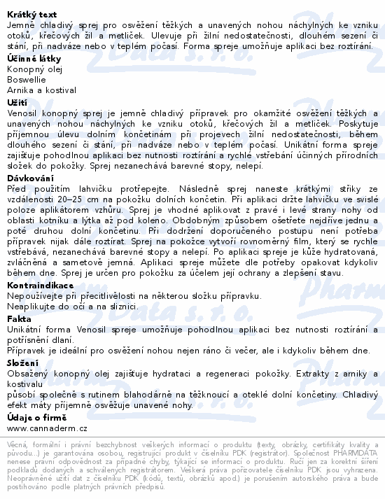 Jemně chladivý sprej pro osvěžení těžkých a unavených nohou náchylných ke vzniku otoků, křečových žil a metliček. Ulevuje při žilní nedostatečnosti, dlouhém sezení či stání, při nadváze nebo v teplém počasí. Forma spreje umožňuje aplikaci bez roztírání.