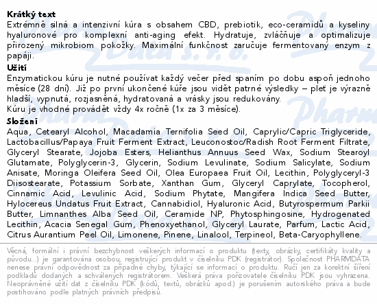 Extrémně silná a intenzivní kúra s obsahem CBD, prebiotik, eco-ceramidů a kyseliny hyaluronové pro komplexní anti-aging efekt. Hydratuje, zvláčňuje a optimalizuje přirozený mikrobiom pokožky. Maximální funkčnost zaručuje fermentovaný enzym z papáji.