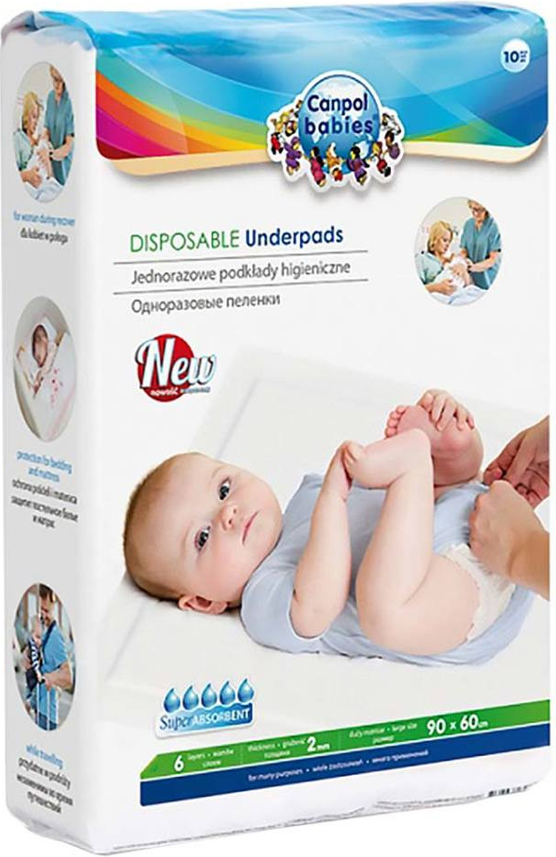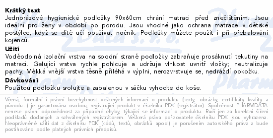 Jednorázové hygienické podložky 90x60cm chrání matraci před znečištěním. Jsou ideální pro ženy v období po porodu. Jsou vhodné jako ochrana matrace v dětské postýlce, když se dítě učí používat nočník. Podložky můžete použít i při přebalování kojenců.